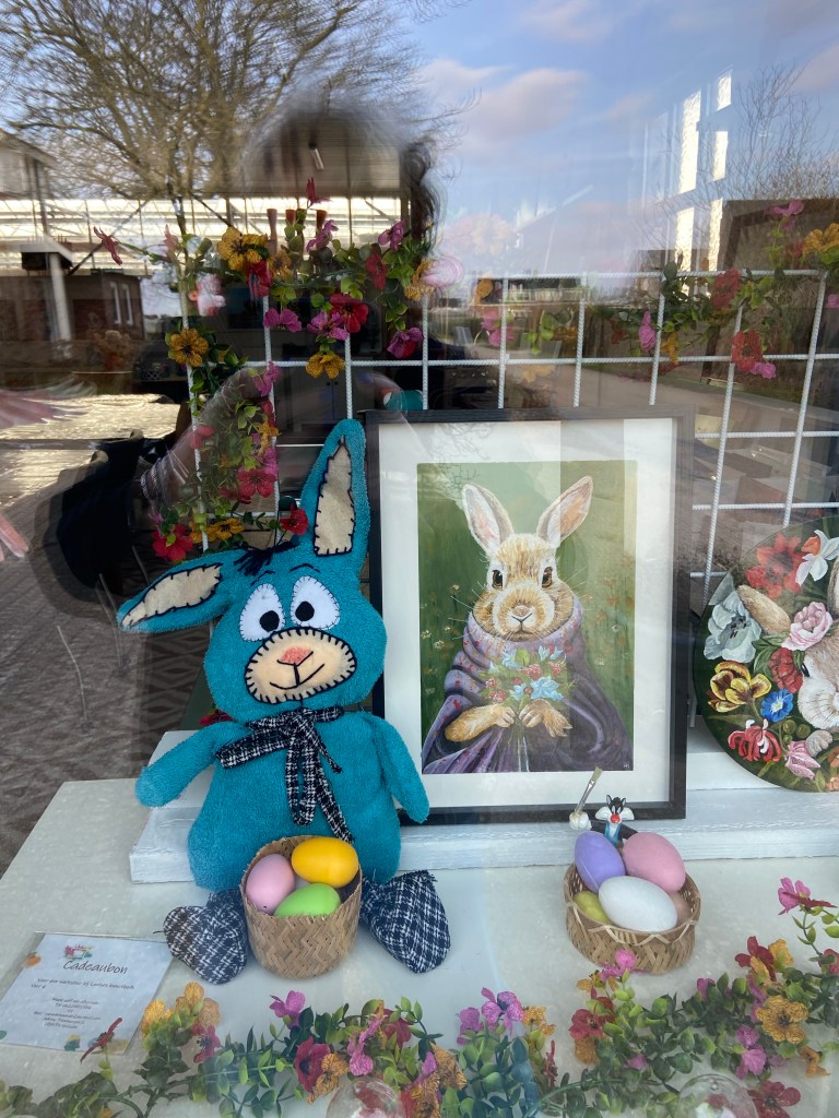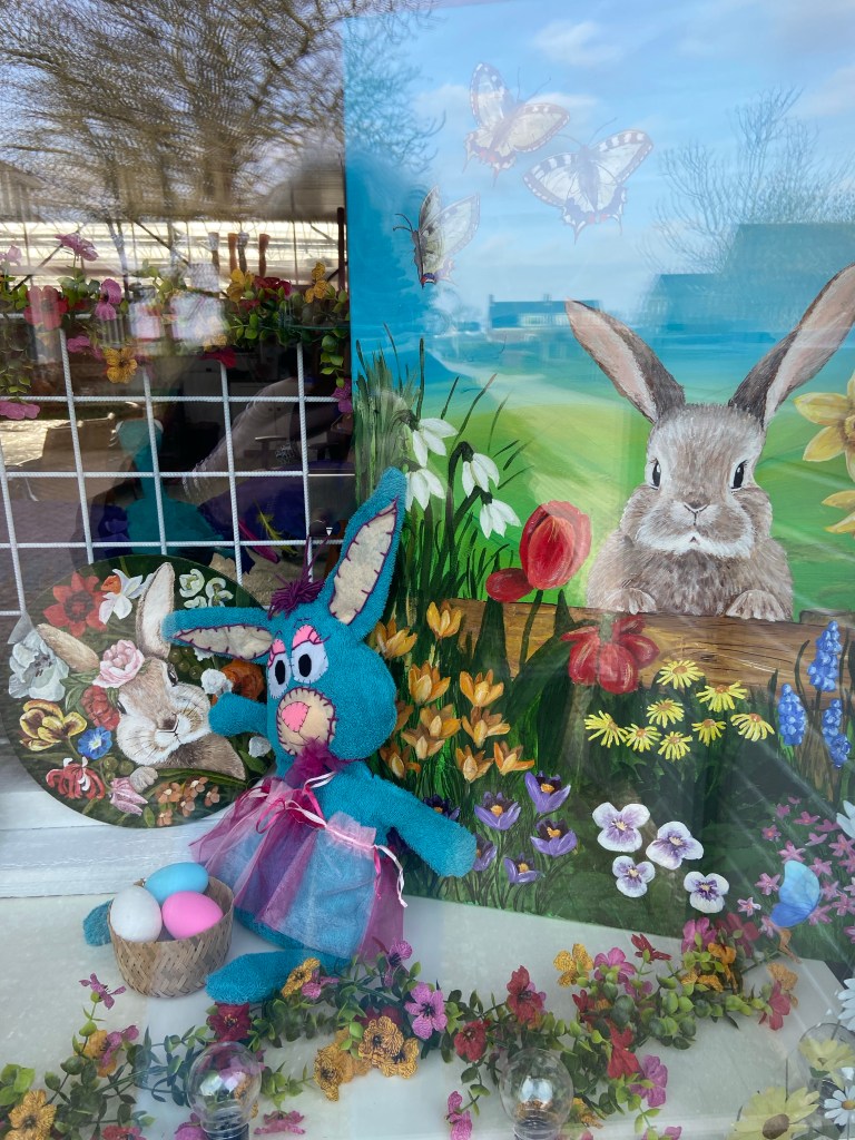 Etalage; In lente en paas sfeer met veel hazen!