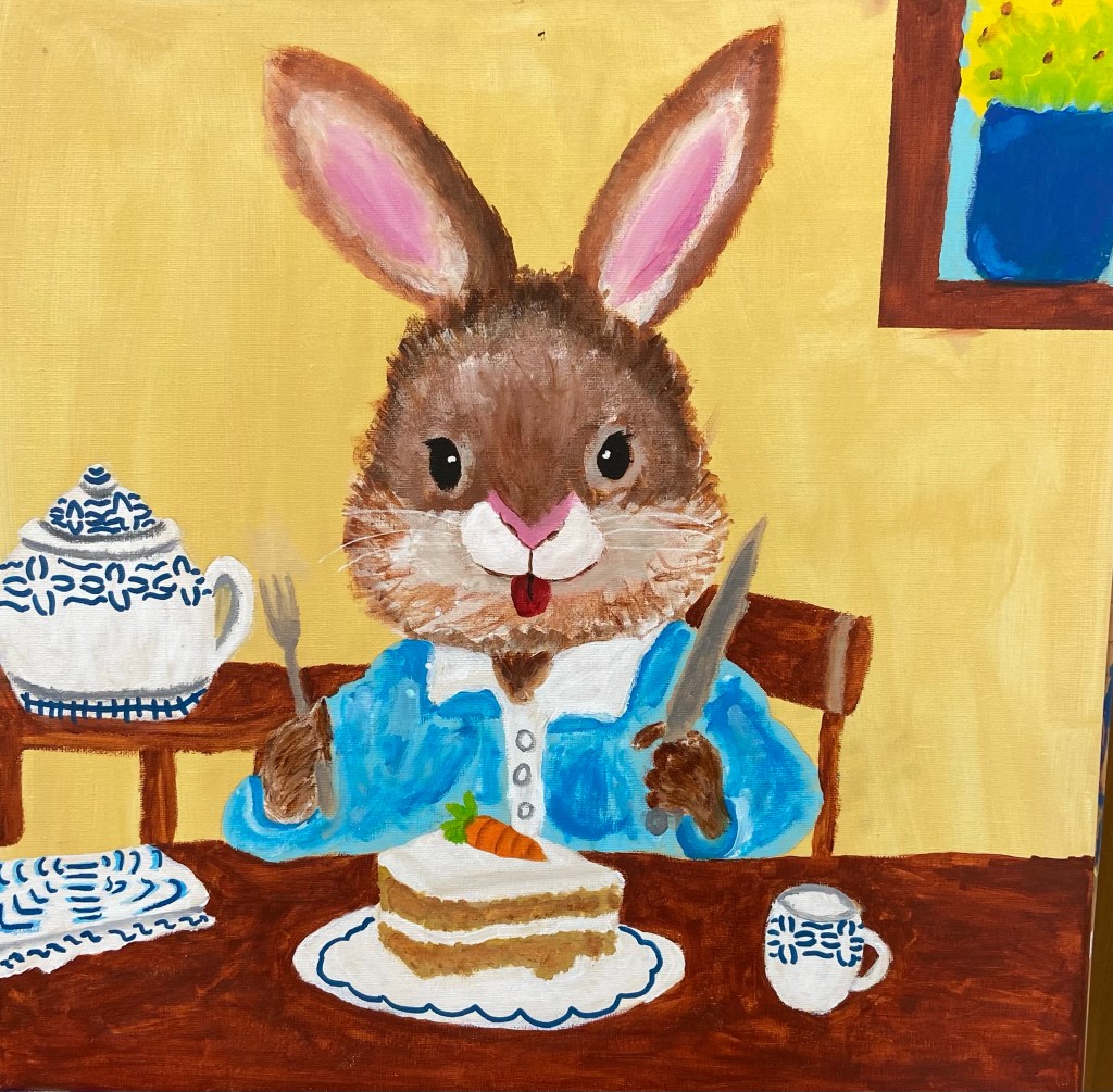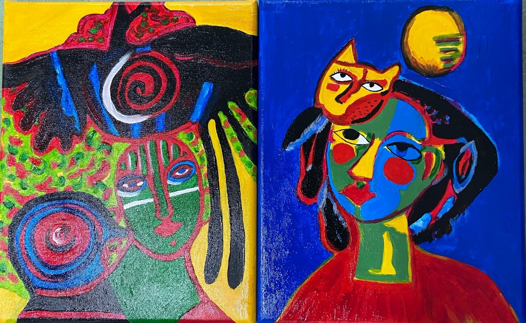 Jeugdatelier door Sara (14jr) de kat en de papegaai door Naomi ( 8 jr)