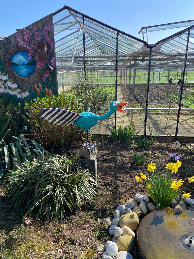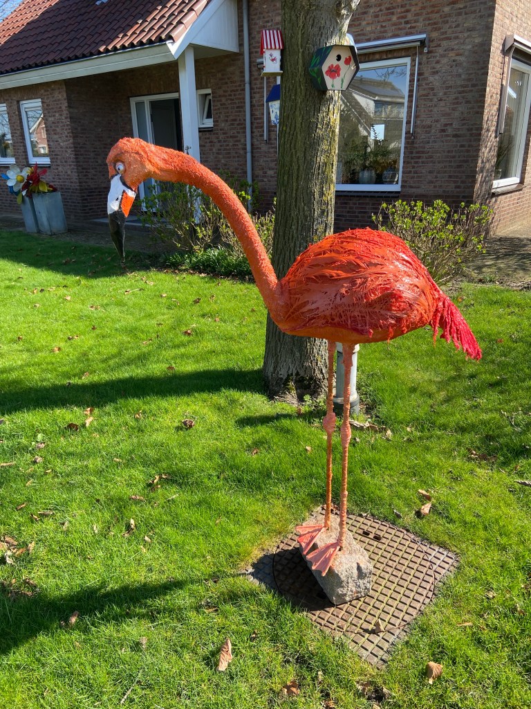 Flamingo , gemaakt met een frame en bekleedt met stof en powertex!! Ntk. En een vreemde vogel (zelfde materialen) is neergestreken in de achtertuin! En wat bloemen in de voortuin!.
